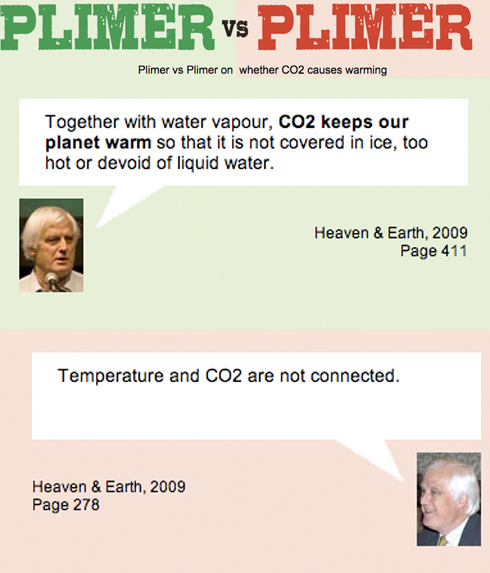 If you’re confused at this point, you’re not alone! Which Plimer are we to believe? The Plimer who considers the full body of evidence and comes to conclusions consistent with the scientific consensus that increased greenhouse gases causes warming? Or the Plimer who cherry picks the data, withholds vital pieces of evidence and misleads the public. I know which I prefer.