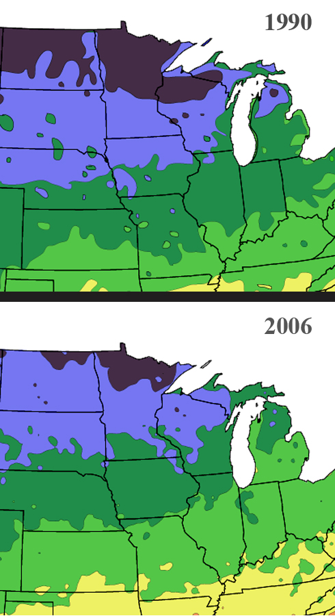 Astute readers will recognize that the US Department of Agriculture’s Hardiness Zones maps have changed over the years, reflecting weather changes obvious to farmers, gardeners, or anyone who spends time outdoors throughout the year. A quick look at the comparison between 1990 and more recent years shows why winter, not just this winter, but any winter, feels more like Kentucky than the upper midwest I grew up in.(these comparative maps, based on NCDC data, are from the Arbor Day Foundation, and demonstrate the changes)