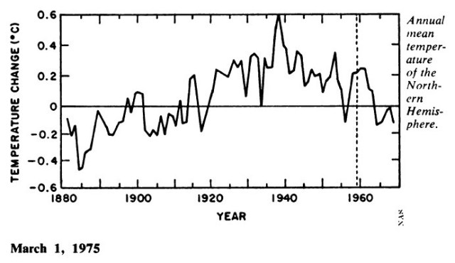 The significance of the 1975 NAS graph of Northern Hemisphere temperatures is that it shows that in 1975 the temperature records were reported as showing that the Northern Hemisphere had been cooling sharply since peaking in about 1938, and in fact had already cooled down to 1900 levels by the late 1960s. The great fear of leading alarmist climatologists, in the 1970s, was that we were heading into a renewed ice age, and that NAS graph supported that fear.