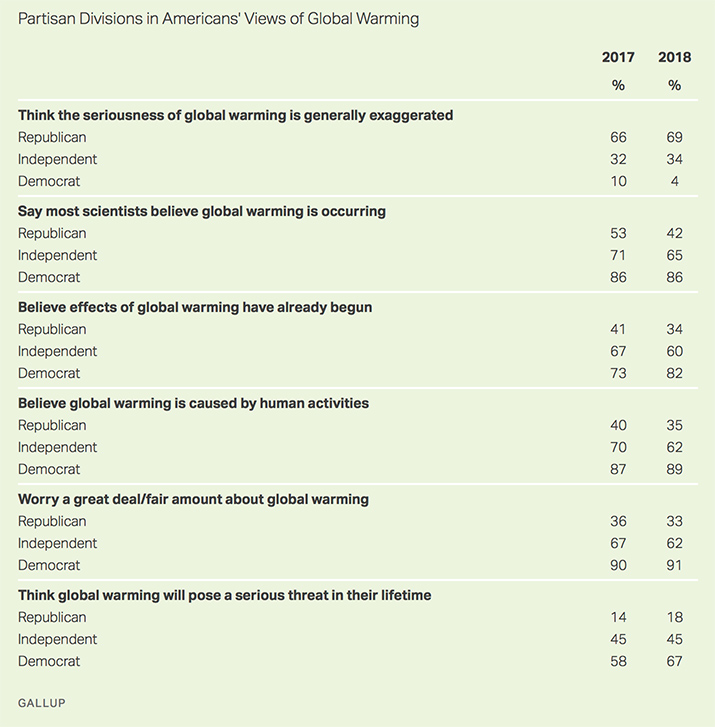 • Eighty-six percent of Democrats versus 42% of Republicans think most scientists believe global warming is occurring. The percentage of Republicans who say most scientists believe this is down 11 percentage points since last year.